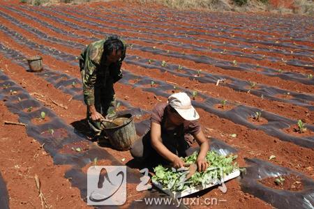 已近中午时分,山角村的普天富和妻子正顶着烈日在烟地里补苗。妻子端着烟苗盘,顺着烟墒弯着腰一棵一棵查看被晒枯了叶子的烟苗。她用手指轻轻扒开苗塘里的土,只要见苗杆还有绿色,就不补了。记者问她:“这种苗还会活吗?”她低着头边走边说:“哪有那么多的苗来补,只能补补被晒死的。”