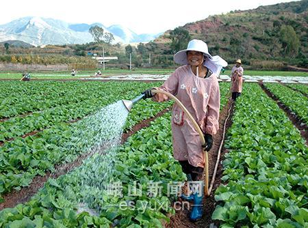 峨山县甸中镇甸尾村委会村民李绍有告诉记者,今年烤烟收后他家种了6亩大白菜,平均每亩白菜收入5000元左右,一年两茬白菜加上烤烟,全家收入有10万元左右。近年来,甸尾村委会大力发展蔬菜产业,今年全村种植白菜、生菜、花菜等蔬菜3000亩左右,蔬菜种植已成为村民增收的主导产业。 (记者 陈佳 摄)