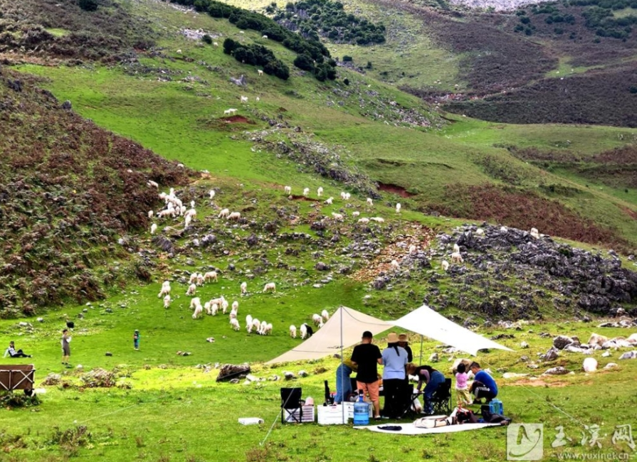 10月6日,秋高气爽,在华宁县通红甸乡么波冲自然景区,草地、羊群、风车构成了一幅美丽的风景画。部分市民和游客纷纷前来打卡,有的搭起了帐篷露营,有的在草地上拍照,尽情亲近大自然,享受美好假期。(玉溪日报全媒体记者 高倩)