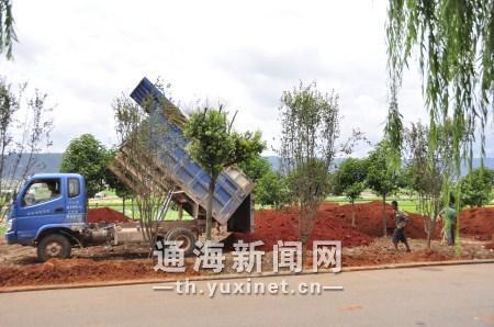 在杞麓湖南岸长河段,运松红土的车辆往来,工人们分工合作,开挖树坑、植入树苗、填土、浇水,施工现场如火如荼,一株株垂丝海棠、桂花扮靓了湖岸,配合着垂柳和喜树等树木,湖岸一派生机盎然的景象。