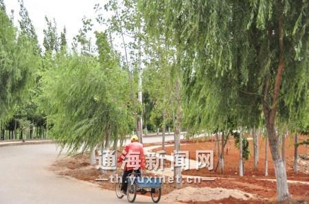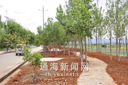 6月11日,在杞麓湖南岸红旗河四门闸段,新种植的树木随风摇曳,在阳光下郁郁葱葱,林间新铺设蜿蜒曲折的游路刚刚完成硬化,这是通海县杞麓湖南岸湖堤生态修复工程的一角。
