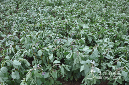 由于受低温雪冻天气影响,截至12月17日上午8时30分,易门县共有3万余亩农作物受灾,其中菜豌豆受灾14545亩,有8000亩绝收;蚕豆受灾4162亩,有791亩绝收;油菜受灾6531亩,有1225亩绝收。图为浦贝乡草箐村受灾的蚕豆苗。(朱云杉 马迎春 摄)