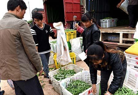 11月6日,华宁县青龙镇海镜蔬菜交易市场异常热闹,附近村子的菜农聚集在此交售豌豆。收购商施应龙介绍: “这里每天都有三四十辆车来收豌豆,一天至少要运出去三四十吨新鲜豌豆,价格都在10块钱左右一公斤,近一个月来都是产销两旺的状况。” (特约通讯员 施锦泉 摄)