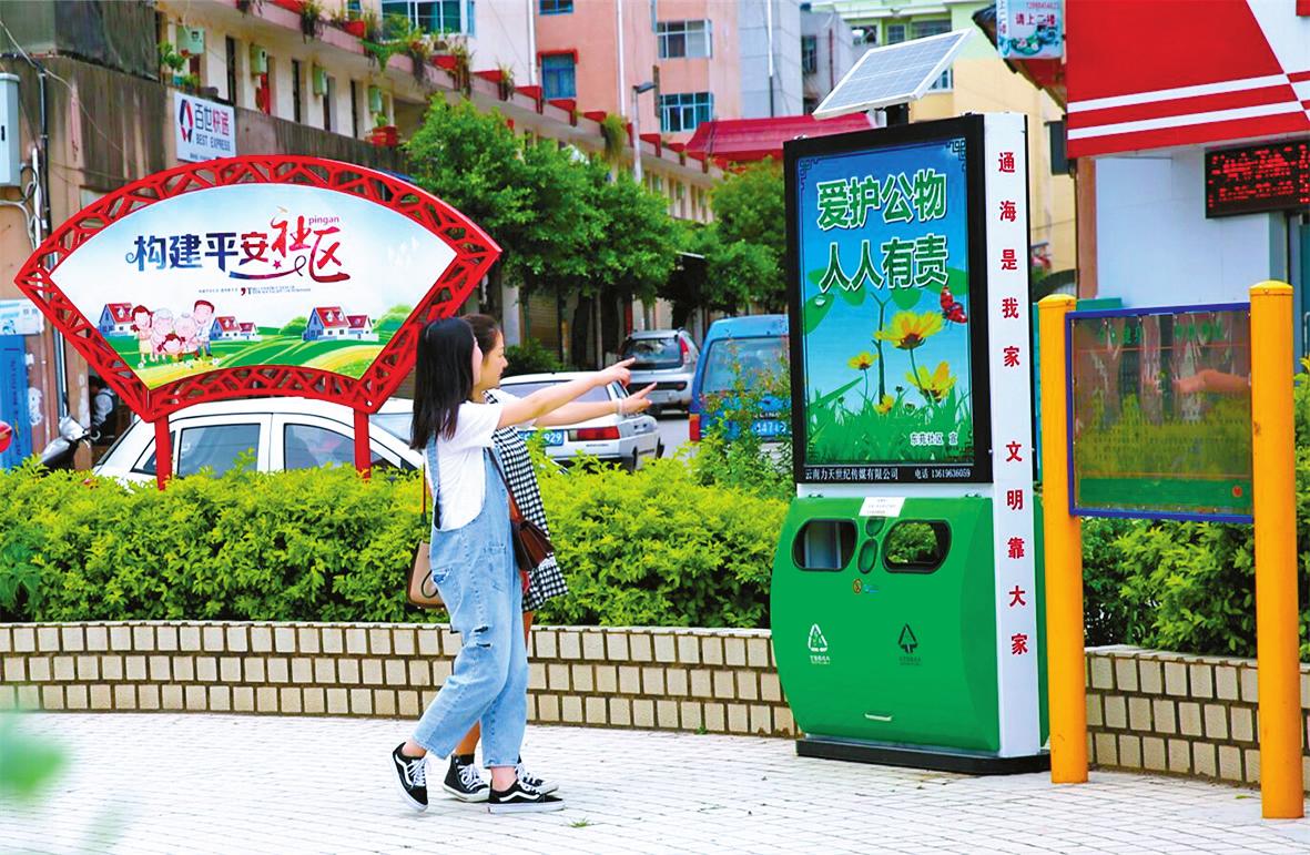 近日,一批“绿色”太阳能保洁箱在通海县东苑社区投放使用,其时尚靓丽的“颜值”吸引了不少过往行人的目光;方便实用、垃圾分类收集、使用清洁能源的优点也赢得了社区居民一致好评。同时,灯箱上还配套了“社会主义核心价值观”“文明城市创建”等精神文明建设相关内容,与社区建设的“文化墙”形成多层次文明新风宣传“阵地”。
