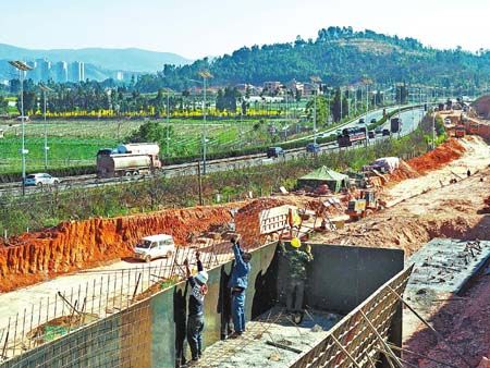2月17日下午,在玉磨铁路研和车站施工现场,压路机正在压实站场路基土层,运土车往来穿梭,工人忙着扎钢筋、支模板。截至目前,该站已完成投资1亿元左右,占总投资的三分之一。据了解,玉磨铁路研和车站由中铁六局承担施工建设,占地1969亩,总投资3.47亿元,于去年10月开工。该站是玉磨铁路的货运站,待玉磨铁路全线建成后,将作为整个云南的中心物流中转站。