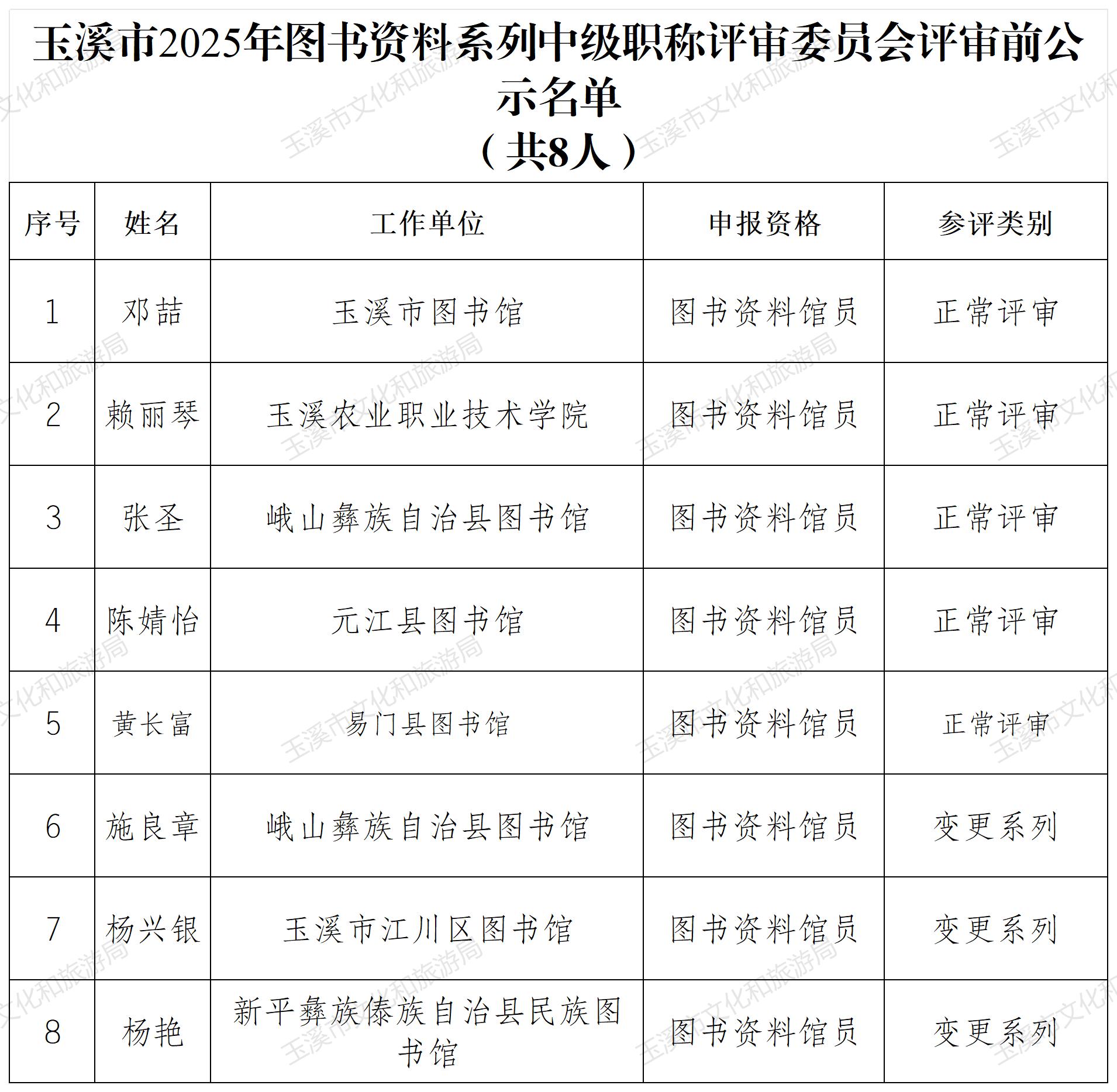 4.玉溪市2025年图书资料系列中级职称评审委员会评审前公示名单