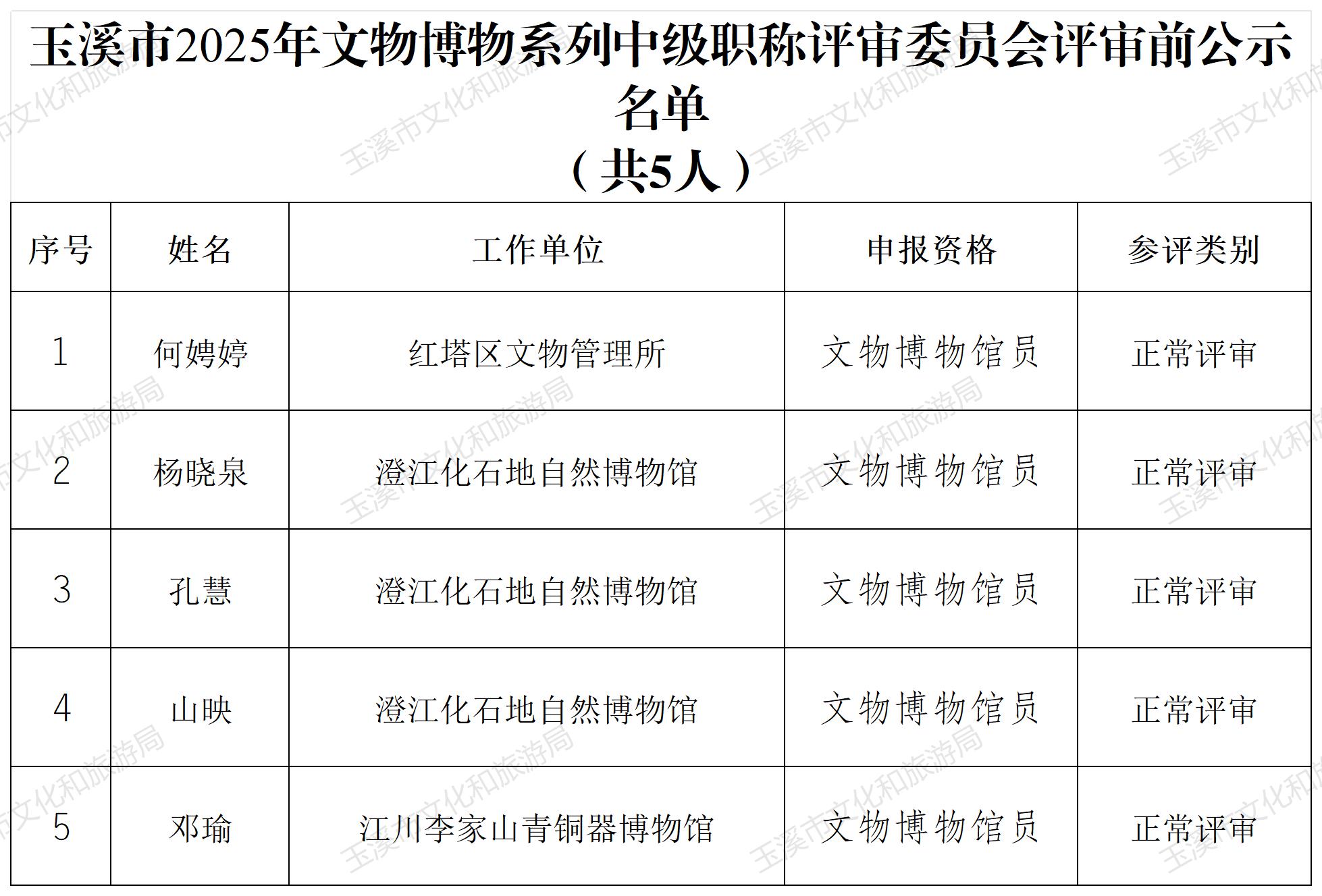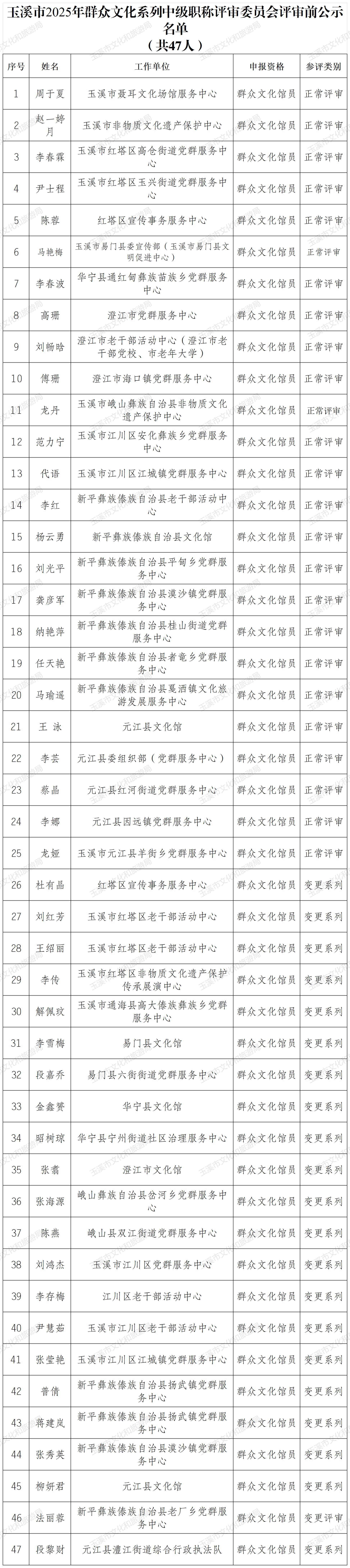 5.玉溪市2025年群众文化系列中级职称评审委员会评审前公示名单